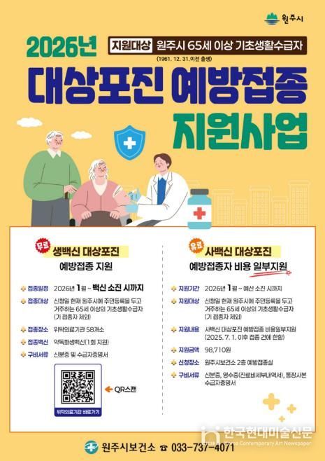 한국현대미술신문 원진 기자 | 원주시는 고령층의 건강 보호와 경제적 부담 경감을 위해 2025년 7월 1일부터 대상포진 예방접종 지원사업을 무료로 시행하고 있다.