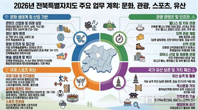 한국현대미술신문 기자 | 전북특별자치도가 2026년 문화·관광·체육 정책을 재정비한다. 창작 기반과 산업, 지역 경제로 이어지는 구조를 구축하고, 정책 간 경계를 낮춰 수요와 현장 중심으로 재편한다는 구상이다.