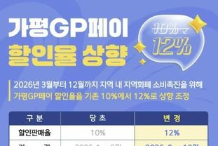 한국현대미술신문 배윤섭 기자 | 가평군은 오는 3월부터 지역화폐인 ‘가평GP페이’ 인센티브를 기존 10%에서 12%로 상향한다고 밝혔다. 다만 금융기관 시스템 점검으로 인해 충전은 3월 2일 0시부터 가능하다.