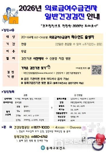 한국현대미술신문 정소영 기자 | 부산 동래구는 의료취약계층의의 질환을 조기에 발견하고 건강 증진을 도모하기 위해 ‘의료급여 수급권자 일반건강검진’ 수검을 적극 독려하고 있다고 밝혔다.