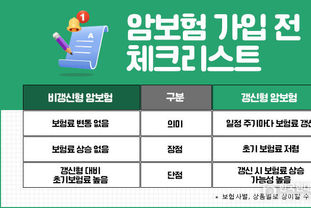 보험료 부담을 줄이려다 보면 저렴한 암보험을 찾게 마련인데 이때 암보험이 갱신형인지 비갱신형인지도 확인할 필요가 있다. 갱신형 암보험은 처음 납입하는 보험료가 저렴하게 느껴지지만 갱신을 할수록 보험료가 계속 높아질 수 있다. 반면 비갱신형은 초기 보험료는 갱신형보다 비싸게 느껴질 수 있지만 앞으로 오르지 않는다는 장점이 있으므로 갱신형 보험보다는 유지 면에서 유리하다. 개인의 소득과 생활패턴, 연령이 다르므로 암보험 갱신형과 비갱신형 중 선택을 하기 전 이러한 차이를 잘 알아두고 본인에게 가장 적합한 것을 고르는 것이 좋다.