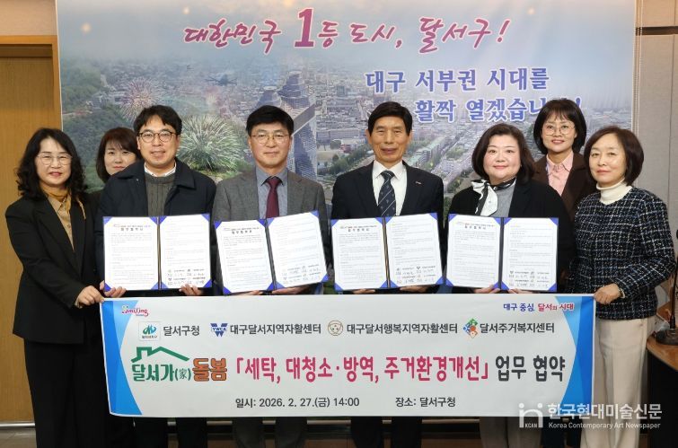 이번 협약은 세탁, 대청소·방역, 주거환경 개선 등 생활밀착형 서비스를 제공하기 위한 것으로, 전문 역량을 갖춘 지역 기관과의 민·관 협력을 통해 보다 촘촘한 지역사회 돌봄망을 구축하고 달서구만의 통합돌봄 모델인‘달서가(家)돌봄’사업을 안정적으로 정착시키기 위해 마련됐다.
