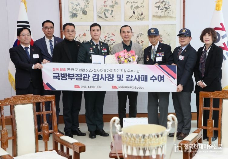 한국현대미술신문 원진 기자 | 강원특별자치도는 국방부 유해발굴감식단이 추진한 ‘2025년 민·관·군 협업 6·25전사자 유가족 집중 찾기’ 사업에서 전국 최초 민관군 협업 6.25전사자 유가족 찾기 지원 우수기관으로 선정돼, 3월 9일 국방부장관으로부터 감사장과 감사패를 수상했다고 밝혔다.