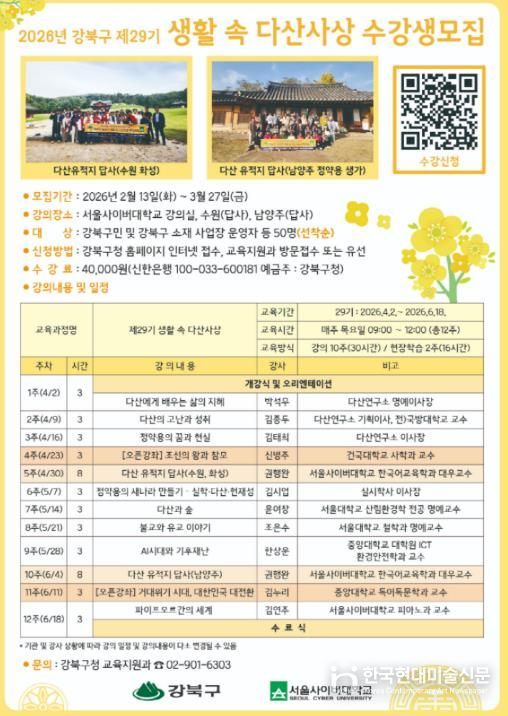 한국현대미술신문 배건 기자 | 서울 강북구는 다산 정약용의 사상과 인문학적 가치를 생활 속에서 쉽게 접할 수 있도록 '제29기 생활 속 다산사상' 수강생을 모집한다고 밝혔다.