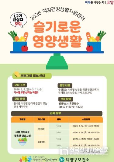 한국현대미술신문 배윤섭 기자 | 고양특례시 덕양구보건소 덕양건강생활지원센터는 지역주민의 건강한 식생활 실천을 돕기 위해 영양교육과 요리실습을 결합한 프로그램 ‘슬기로운 영양생활’ 1·2기 참여자를 모집한다.
