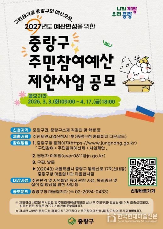 한국현대미술신문 배건 기자 | 중랑구가 2027년도 예산에 반영할 주민참여예산 사업을 발굴하기 위해 오는 3월 3일부터 4월 17일까지 총 11억 원 규모의 주민참여예산 제안사업 공모를 실시한다.
