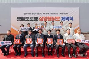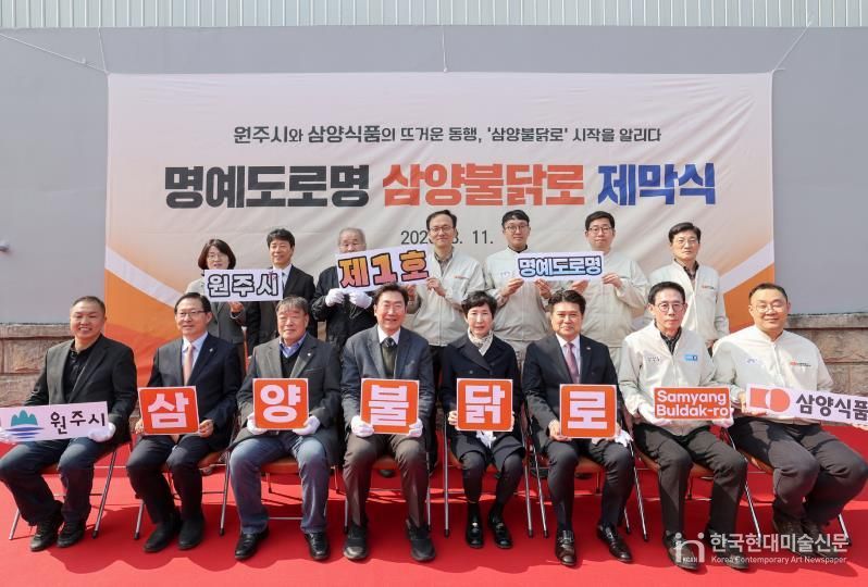 한국현대미술신문 원진 기자 | 원주시는 지난 11일 우산동 삼양식품 원주공장 인근에서 원주시 제1호 명예도로명인 ‘삼양불닭로’ 제막식을 열었다. 이날 행사에는 원강수 시장과 김정수 삼양식품 부회장, 김동찬 삼양식품 대표 등 관계자 30여 명이 참석했다.