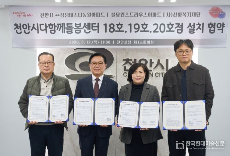 한국현대미술신문 신정은 기자 | 천안시는 12일 시청 제1소회의실에서 성성비스타동원·불당린스트라우스 아파트 입주자대표회의, 사회복지법인 신아복지재단과 ‘다함께돌봄센터 18·19·20호점 설치장소 제공’을 위한 협약을 각각 체결했다.