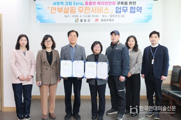 한국현대미술신문 원진 기자 | 철원군은 2026년 3월13일 오전 10시, 철원군청 2층 군수 집무실에서 철원우체국(국장 최은애)과 ‘안부살핌 우편서비스’업무협약식을 체결했다.