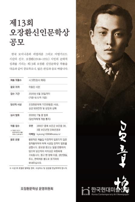 한국현대미술신문 신정은 기자 | 충북 보은군과 오장환 문학상 운영위원회는 한국 모더니즘과 리얼리즘, 아방가르드 시단의 선구자로 평가받는 오장환(1918~1951) 시인의 문학 정신을 기리고 유망한 신인 시인을 발굴하기 위해 ‘제13회 오장환 신인문학상’ 작품을 공모한다.