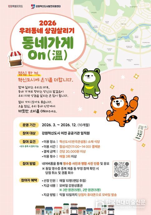 한국현대미술신문 원진 기자 | (재)강원혁신도시발전지원센터에서는 강원혁신도시 이전 공공기관 임직원을 대상으로 지역 상권 활성화를 위한 ‘2026 우리동네 상권살리기 동네가게 On(溫)’사업을 추진한다고 밝혔다.