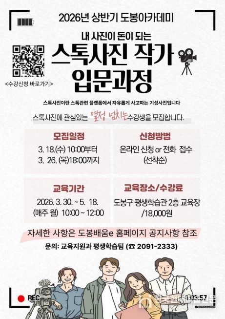 한국현대미술신문 배건 기자 | 서울 도봉구가 오는 3월 30일부터 5월 18일까지 매주 월요일 도봉구 평생학습관 2층 대강의실에서 ‘스톡사진 작가 입문과정’을 운영한다고 밝혔다.