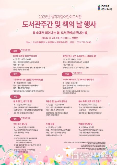 한국현대미술신문 원진 기자 | 원주시 생각자람어린이도서관은 ‘도서관주간’과 ‘세계 책의 날’을 기념해 4월 12일부터 23일까지 강연, 공연, 체험, 전시 등 다양한 문화 행사를 운영한다.