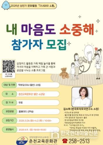 한국현대미술신문 원진 기자 | 춘천교육문화관은 4월 11일 오후 2시 본관 소강당에서 부모와 자녀가 함께 참여하는 가족 체험형 프로그램 ‘내 마음도 소중해’를 운영한다.