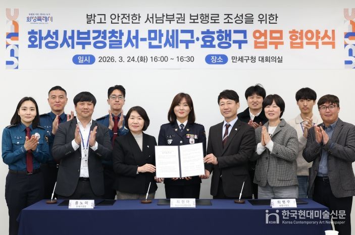 한국현대미술신문 배윤섭 기자 | 화성특례시 만세구는 24일 만세구청 대회의실에서 화성서부경찰서, 효행구청과 함께 ‘밝고 안전한 서남부권 보행로 조성을 위한 업무협약(MOU)’을 체결했다고 밝혔다.