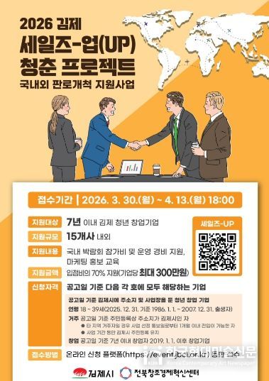 한국현대미술신문 기자 | 김제시는 청년 창업기업의 시장 진출 확대와 매출 증대를 지원하기 위해 청년 창업기업 판로개척 지원 사업'2026년 김제시 세일즈-업(UP) 청춘 프로젝트'를 본격 추진한다고 밝혔다.