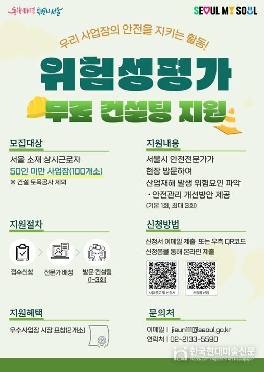 한국현대미술신문 배건 기자 | 서울시가 산업재해에 취약한 소규모 사업장의 안전관리 강화를 위해 ‘위험성평가 무료 컨설팅’ 지원에 나선다. 복잡한 제도와 인력 부족으로 위험성평가 이행에 어려움을 겪는 사업장을 대상으로, 전문가가 직접 현장을 찾아 실질적인 개선 방안을 제공한다.