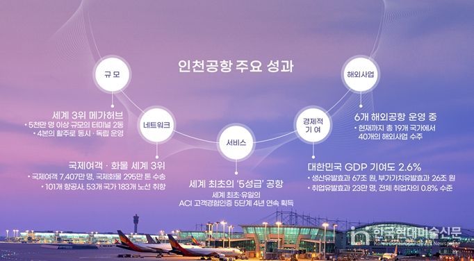 지난 2001년 3월 29일 개항한 인천공항은 정부의 일관된 정책지원과 국민적 성원에 힘입어 개항 25년 만에 국제여객 및 화물, 인프라 기준 ‘글로벌 TOP 3 공항’이자 명실상부한 동북아 허브공항으로 도약했다.