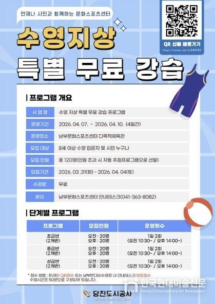 한국현대미술신문 신정은 기자 | 당진도시공사는 시민들의 수영 기초 역량 향상과 안전한 수영장 이용 문화 조성을 위해 '수영 단계별 지상 특별 무료 강습 프로그램'을 운영한다.