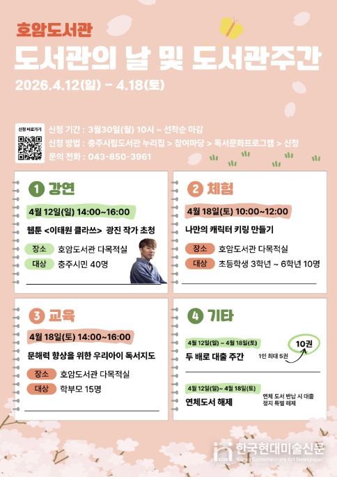 한국현대미술신문 신정은 기자 | 충주시 호암도서관은 제4회 ‘도서관의 날’과 제62회 ‘도서관주간’을 맞아 4월 12일부터 18일까지 7일간 다채로운 독서문화 행사를 운영한다고 2일 밝혔다.