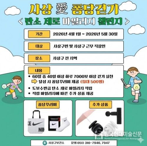 한국현대미술신문 정소영 기자 | 사상구보건소는 일상 속 걷기 실천율을 높이고 건강증진을 위해 4월 1일부터 5월 30일까지 두 달간 ‘2026년 사상퐁당걷기 탄소제로 마일리지 챌린지’를 펼친다.