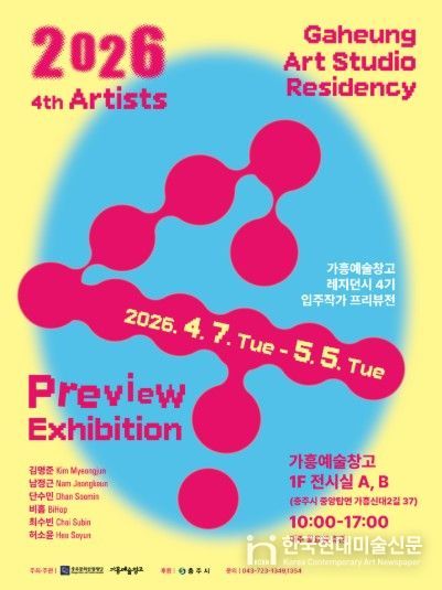 한국현대미술신문 신정은 기자 | 충주문화관광재단은 4월 7일부터 5월 5일까지 가흥예술창고에서『2026 가흥예술창고 레지던시 4기 입주작가 프리뷰전』을 개최한다고 밝혔다.
