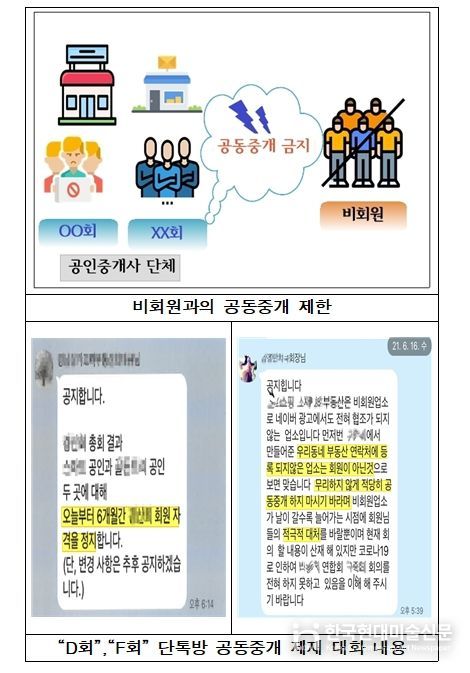 이 단톡방에“공멸하지 않으려면 비회원을 축소·위축시켜야 합니다.”, “D회 총회 결과 공인중개사와 ◇◇공인중개사 2곳에 대해 6개월간 회원자격을 정지합니다.”라는 등 비회원과 공동중개한 회원들을 제재했다.