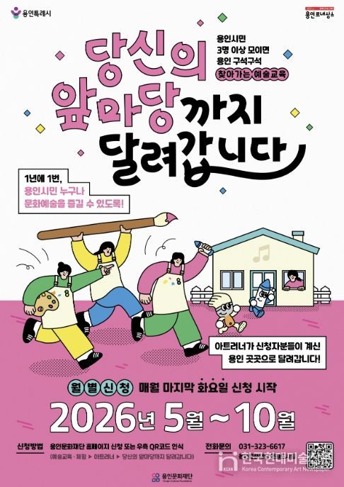 한국현대미술신문 배윤섭 기자 | 용인문화재단은 시민이 원하는 시간과 장소로 직접 찾아가는 2026 찾아가는 예술교육 '당신의 앞마당까지 달려갑니다'의 참여자를 오는 4월 7일부터 모집한다.