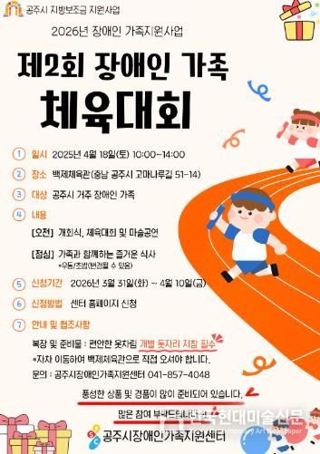 한국현대미술신문 신정은 기자 | 공주시장애인가족지원센터는 제46회 장애인의 날을 기념해 오는 4월 18일 오전 10시부터 오후 2시까지 백제체육관에서 ‘제2회 공주시 장애인 가족 체육대회’를 개최한다고 밝혔다.