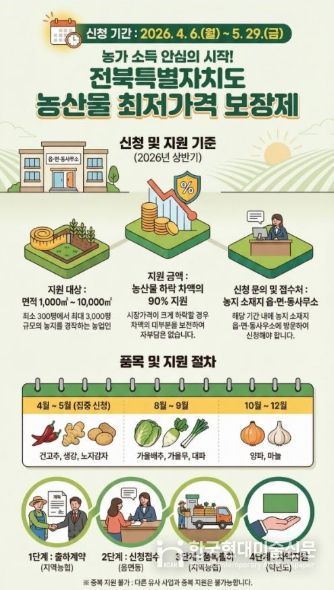 김신중 전북자치도 농생명정책과장은 “기후변화와 소비 위축으로 농산물 가격 불안정이 지속되는 상황에서 최저가격 보장제는 농민들이 안심하고 생산에 전념할 수 있도록 하는 핵심 제도”라며 “신청 기간을 놓쳐 지원에서 제외되는 일이 없도록 적극적인 참여를 당부한다”고 말했다