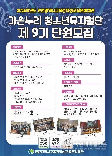 한국현대미술신문 박재남 기자 | 인천광역시교육청학생교육문화회관은 4월 7일부터 24일까지 인천 지역 청소년을 대상으로 ‘2026년 청소년뮤지컬단 제9기’ 신규 단원을 모집한다.