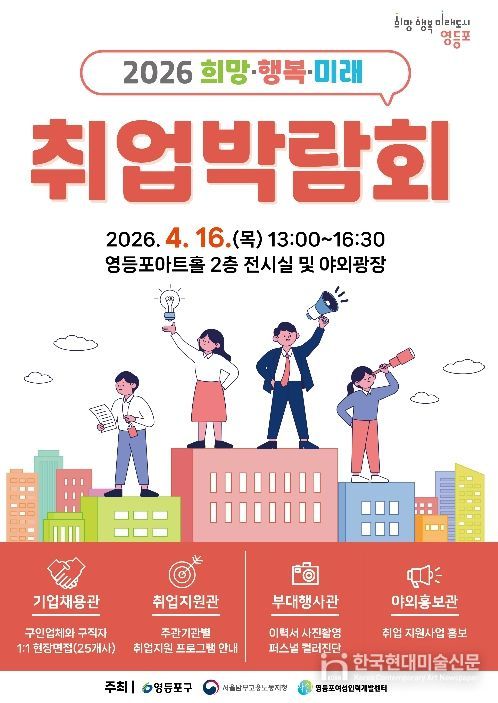 한국현대미술신문 배건 기자 | 영등포구는 오는 4월 16일 영등포아트홀 2층 전시실 및 야외광장에서 320여 개 일자리를 제공하는 ‘2026 희망·행복·미래 취업박람회’를 개최한다고 밝혔다.