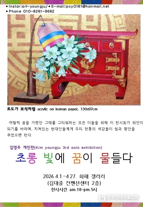 빠르게 변화하는 시대 속에서 잊혀가는 감성과 여유를 되돌아보게 하는 전시가 관람객들의 발길을 끌고 있다. 작가 김영주의 세 번째 개인전 ‘초롱 빛에 꿈이 물들다’가 2026년 4월 1일부터 27일까지 김대중 컨벤션센터 2층 화해 갤러리에서 열리고 있다.