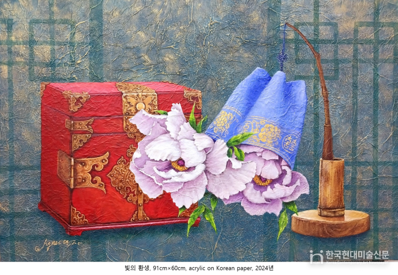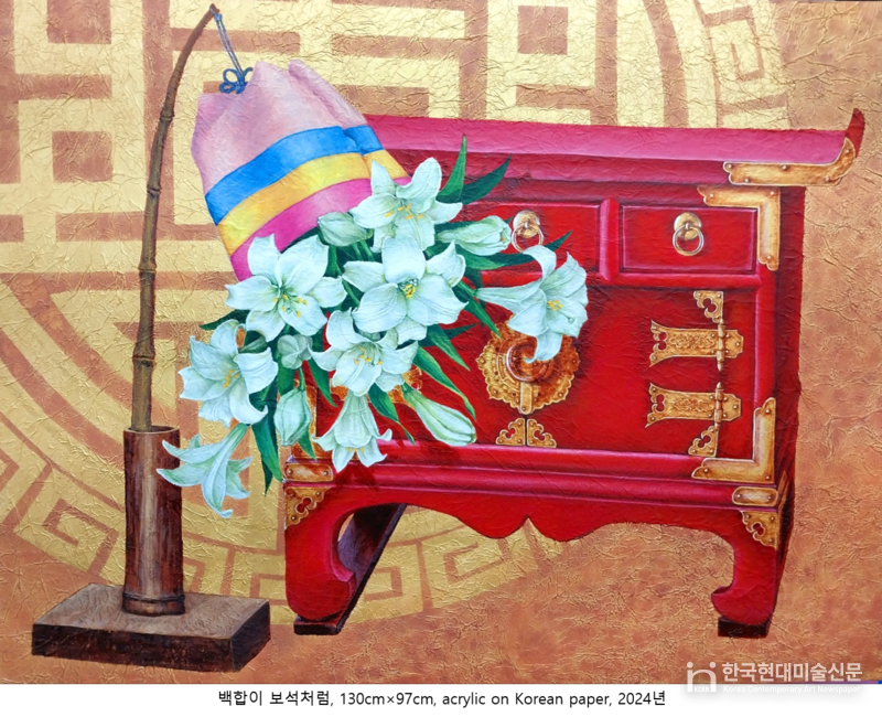 대표작 ‘백합이 보석처럼’은 이번 전시의 핵심 메시지를 집약한 작품이다. 붉은 반닫이 위에 놓인 백합과 초롱은 단순한 정물 구성을 넘어 상징적 의미를 품는다. 붉은 반닫이는 ‘느림과 축적의 시간’을, 초롱은 ‘삶을 비추는 따뜻한 빛’을 의미하며, 그 위에 피어난 백합은 순수와 희망을 상징한다.