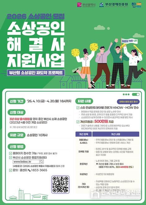 한국현대미술신문 정소영 기자 | 부산시(시장 박형준)와 (재)부산경제진흥원은 오늘(10일)부터 오는 4월 20일까지 '소상공인 해결사 지원사업'에 참여할 지역 음식점업 소상공인을 모집한다고 밝혔다.
