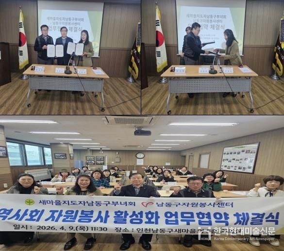 한국현대미술신문 박재남 기자 | 인천시 남동구자원봉사센터는 지난 9일 새마을부녀회와 지역사회 나눔과 자원봉사 활성화를 위한 업무협약(MOU)을 체결했다고 10일 밝혔다.