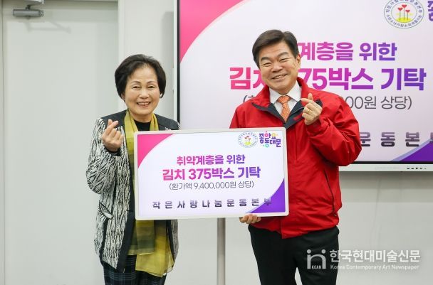 한국현대미술신문 배건 기자 | 서울 동대문구는 9일 작은사랑나눔운동본부(대표 이남숙)로부터 저소득 가정을 위한 김치 2㎏ 375박스(940만 원 상당)를 전달받았다고 밝혔다.