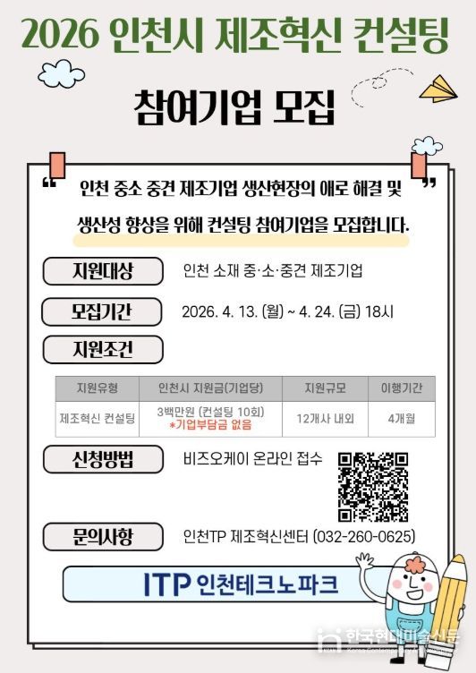 한국현대미술신문 박재남 기자 | 인천테크노파크(인천TP)는 지역 중소·중견기업 제조 현장의 스마트화와 AX(AI 전환)·DX(디지털 전환)를 촉진하기 위해 ‘2026 인천시 제조혁신 컨설팅 지원사업’ 참여기업을 24일까지 모집한다고 밝혔다.