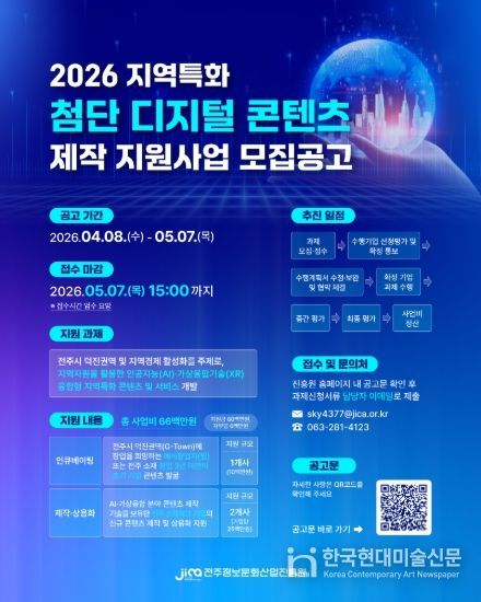 한국현대미술신문 기자 | 전주정보문화산업진흥원은 인공지능(AI)과 가상융합기술(XR)을 전주 고유의 문화·역사 자산과 결합하는 ‘지역특화 첨단 디지털 콘텐츠 제작 지원 사업’에 참여할 기업을 모집한다고 13일 밝혔다.