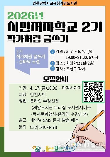 한국현대미술신문 박재남 기자 | 인천광역시교육청계양도서관은 시민의 글쓰기 역량강화와 창작 경험 지원을 위해, 2026년 시민저자학교 2기 ‘작가처럼 글쓰기-손바닥 소설’ 프로그램을 운영한다.