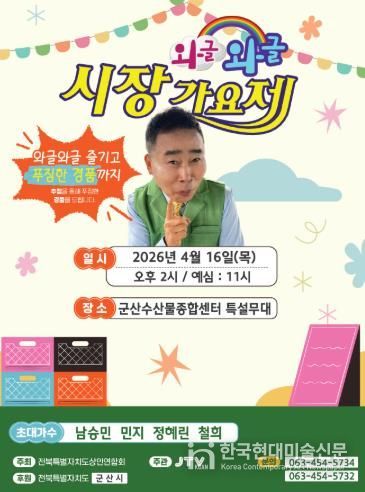 한국현대미술신문 기자 | 군산시가 전통시장에 활력을 불어넣고 시민과 상인이 함께 어우러지는 문화의 장을 마련하고자 ‘와글와글 시장가요제’를 오는 4월 16일 오후 2시, 군산수산물종합센터 신축 건어동 앞 광장에서 개최한다.