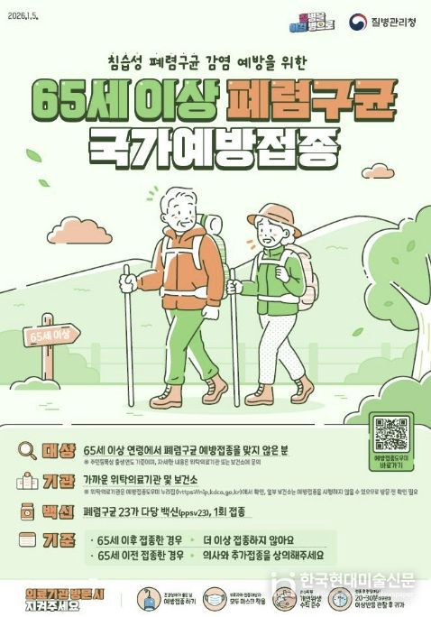 올해 예방접종 대상은 주민등록번호 기준 1961년 12월 31일 이전 출생자로 폐렴구균 접종 이력이 없는 65세 이상 어르신이며 전국 지정 위탁의료기관에서 주소지와 관계없이 무료로 접종 가능하다. 단, 이미 65세 이후 해당 백신의 접종을 완료한 자는 추가 접종을 하지 않아도 된다.