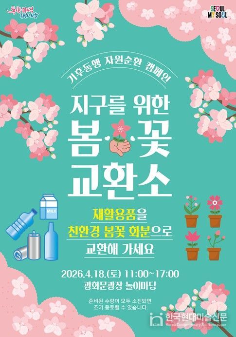한국현대미술신문 배건 기자 | 서울시는 제57회 지구의 날을 기념하여 ‘봄꽃 교환소’를 운영한다. 4월 18일 11시부터 광화문광장 놀이마당에서 열리는'2026 지구의 날'행사장에 일상 속 재활용 가능자원(재활용품)을 가져오면 봄꽃 화분과 교환할 수 있다.