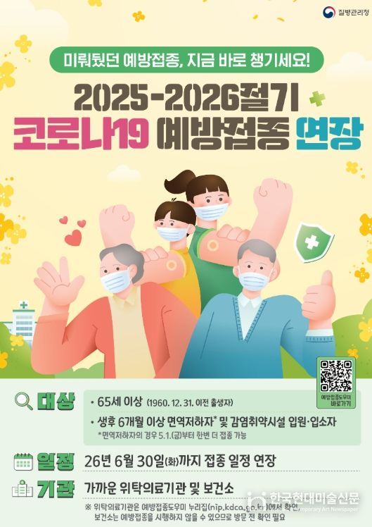 한국현대미술신문 박재남 기자 | 인천 미추홀구는 여름철 코로나19 재유행을 대비해 기존 4월 30일 종료 예정이었던 ‘2025~2026 절기 코로나19 예방접종’을 오는 6월 30일까지 연장한다.