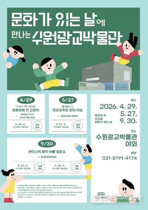 한국현대미술신문 배윤섭 기자 | 수원광교박물관은 4·5·9월 ‘문화가 있는 날’(매달 마지막 주 수요일)에 박물관 야외에서 어린이와 가족 관람객을 위한 무료 공연을 연다.