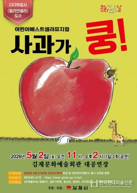 한국현대미술신문 기자 | 동화 속 세상이 무대위로 뿅~ 베스트셀러이자 스테디셀러인 동화를 각색해 만든 어린이 뮤지컬 <사과가 쿵!~>이 오는 5월 2일 오전 11시, 오후 2시 김제문화예술회관 대공연장에서 펼쳐진다.