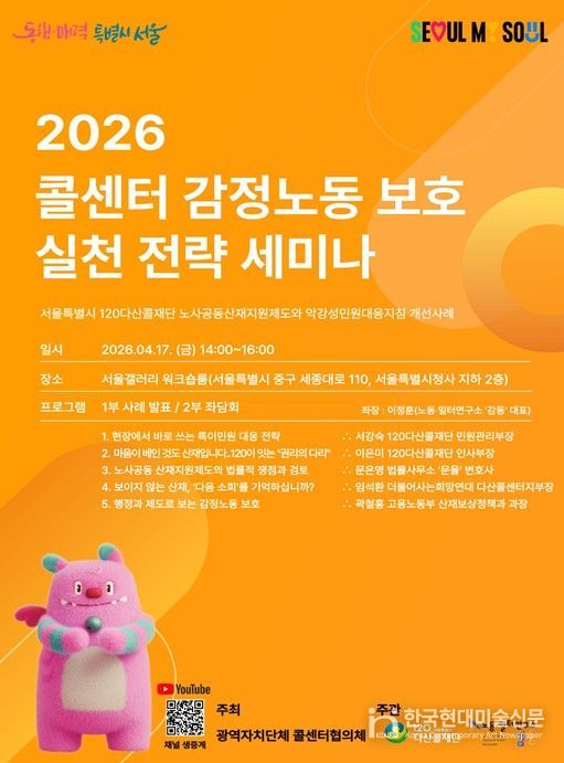 서울특별시 120다산콜재단은 4월 17일 서울갤러리(서울시청 지하1층)에서 광역자치단체 콜센터협의체가 주최하고 서울특별시 120다산콜재단과 노동‧일터연구소 ‘감동’이 공동 주관하는'2026 콜센터 감정노동 보호 실천 전략 세미나'를 개최했다고 밝혔다.