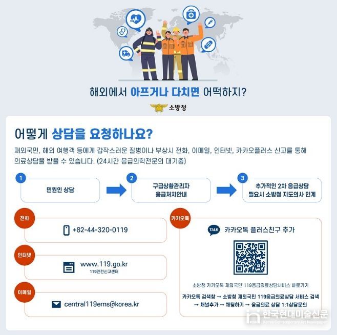 한국현대미술신문 신정은 기자 | 홍성소방서는 해외에서 예기치 못한 질병이나 부상 발생 시 신속한 대응을 돕기 위해 ‘재외국민 119응급의료 상담서비스’ 이용을 홍보한다고 밝혔다.