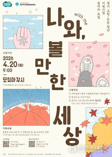 한국현대미술신문 배윤섭 기자 | 경기도가 사회적 관계가 단절된 고립·은둔 청년의 일상 회복을 돕기 위해 20일부터 ‘경기 고립·은둔 청년 지원사업: 나와(with me), 볼만한 세상’ 참여자 300명을 모집한다.