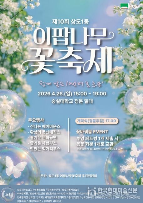 한국현대미술신문 배건 기자 | 동작구는 오는 26일 숭실대학교 정문 일대(상도로 369)에서 ‘제10회 이팝나무 꽃 축제’를 개최한다고 밝혔다.